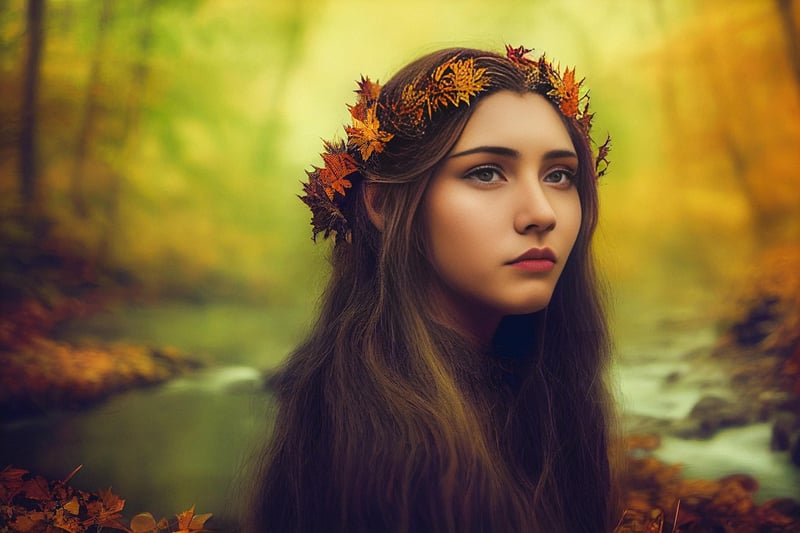 Channel the elegance of Elven royalty in a dress inspired by nature, featuring leaf motifs, flowing fabrics, and a silhouette that captures the essence of the forest.